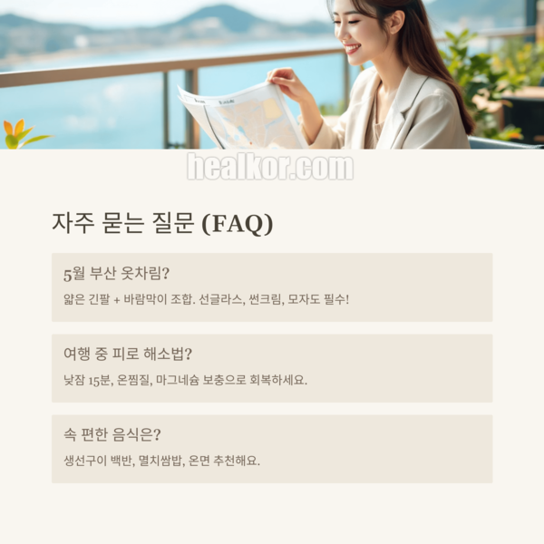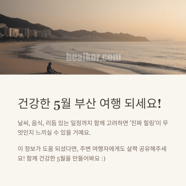 부산은 언제 가도 멋진 도시지만, 5월엔 특히 건강 루틴까지 챙기면 더 빛나는 여행이 돼요. 날씨, 음식, 리듬 있는 일정까지 함께 고려하면 ‘진짜 힐링’이 무엇인지 느끼실 수 있을 거예요.